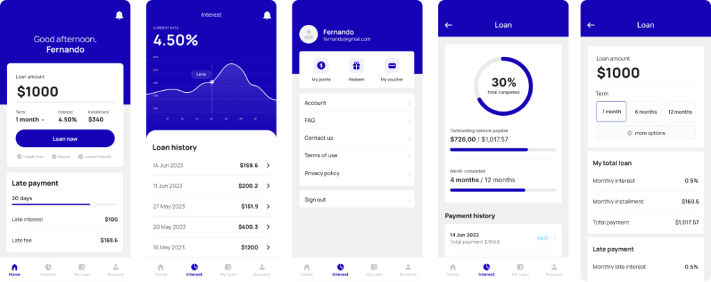 The visual style for the Vein Loan app focused on simplicity and clarity, emphasizing a trustworthy and professional look. A clean, modern color palette of blues and whites was chosen to inspire confidence and ensure visual clarity. We used intuitive icons and data visualizations to help users understand complex financial information at a glance. The design featured a modular layout with card-style elements for easy navigation, allowing users to switch between lending and borrowing tasks effortlessly.